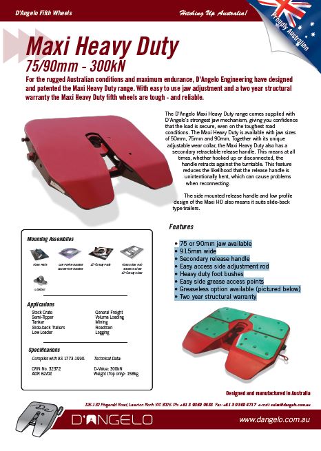 The D’Angelo Maxi Heavy Duty range comes supplied with D’Angelo’s strongest jaw mechanism, giving you confidence that the load is secure, even on the toughest road conditions. The Maxi Heavy Duty is available with jaw sizes of 50mm, 75mm and 90mm. Together with its unique adjustable wear collar, the Maxi Heavy Duty also has a secondary retractable release handle. This means at all times, whether hooked up or disconnected, the handle retracts against the turntable. This feature reduces the likelihood that the release handle is unintentionally bent, which can cause problems when reconnecting.